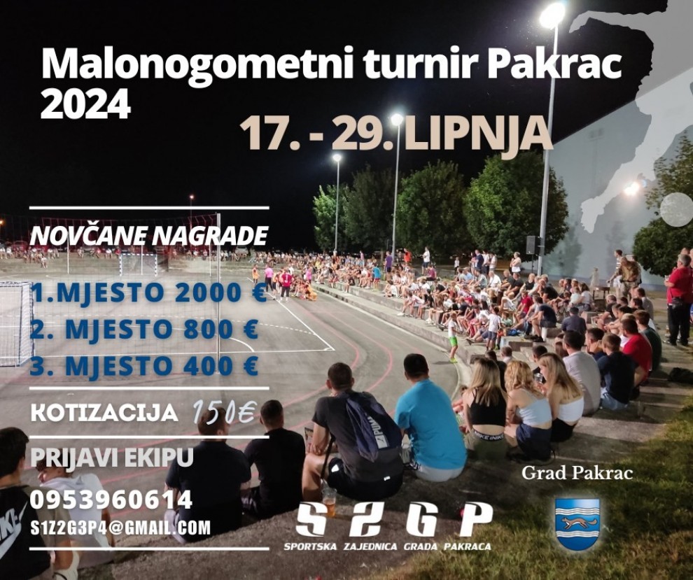 Od 17. do 29. lipnja, na igralištu Srednje škole u Pakracu, bit će održan 27. Ljetni malonogometni turnir. Kako doznajemo od Jasmina Ramića, tajnika Sportske zajednice Grada Pakraca, organizatora ovog turnira, prijave su otvorene, a svoje sudjelovanje ekipe mogu najaviti putem e-maila: S1Z2G3P4@GMAIL.COM ili telefonom na broj: 095/396 06 14.