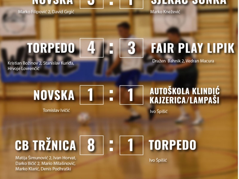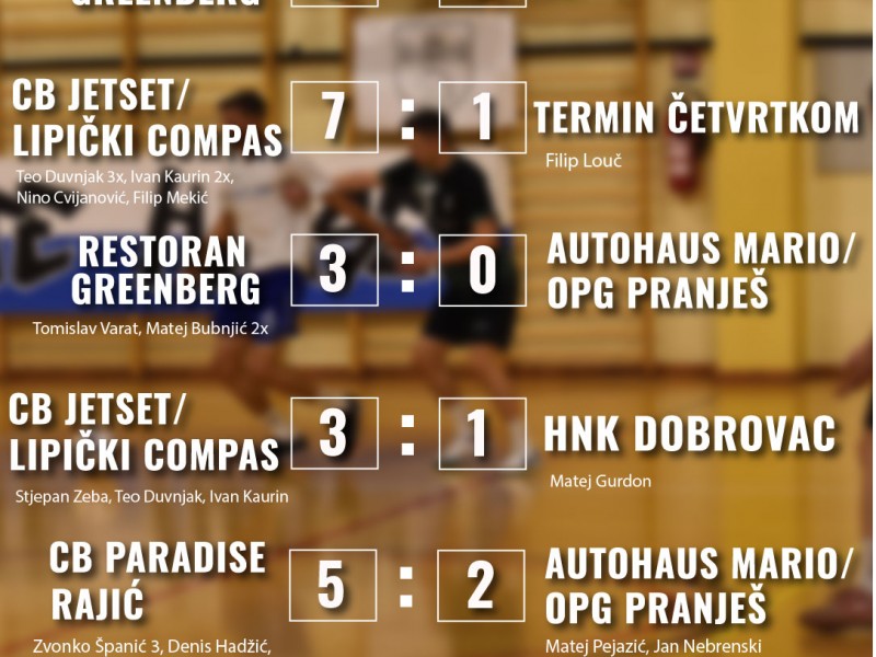 Nogometaši Novske već su prvog dana osigurali nastavak turnira. U premijernoj utakmici svladali su momčad Sjekač šunka rezultatom 3:1, a potom odigrali neriješeno 1:1 s Autoškolom Klindić, što im je bilo dovoljno za prolazak skupine. Drugog dana svoj su posao rutinski odradili i igrači Restorana Greenberg, koji su bez primljenog pogotka upisali dvije pobjede – 3:0 protiv CB Paradise Rajić te istim rezultatom protiv Autohaus Mario/OPG Pranješ.
