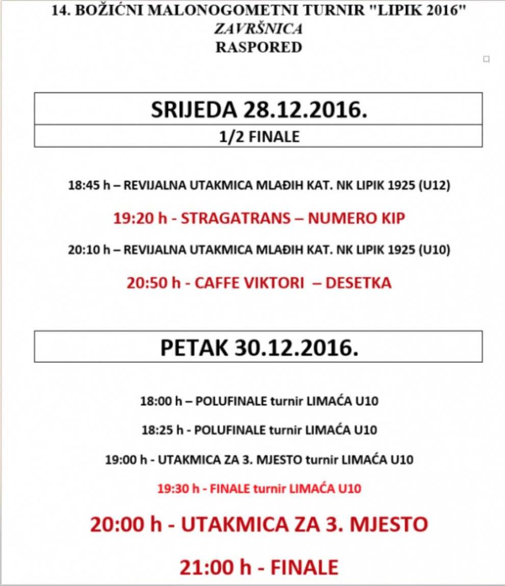 Treba napomenuti kako u četvrtak neće biti seniorskog turnira, ali će dvorana od jutra biti puna. Svoj turnir igrat će limači U-10, koji će svoje finale odigrati u petak prije velikog seniorskog finala.