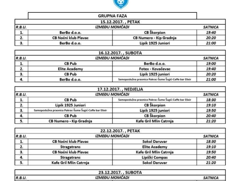 Jučer je odigravanjem triju utakmica započeo 15. Božićni malonogometni turnir Lipik. Nakon prvog dana ekipa BerBo d.o.o., koja slovi za jednog od favorita turnira, je na stopostotnom učinku s obzirom na to da su pobijedili obje utakmice koje su jučer odigrali.