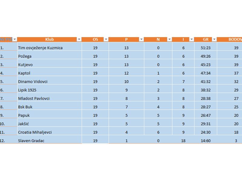 Tablica: 1. Tim osvježenje 39, 2. Kutjevo 39, 3. Požega 39, 4. Kaptol 37, 5. Dinamo Vidovci 32, 6. Lipik 29, 7. Mladost 27, 8. BSK Buk 25, 9. Jakšić 20, 10. Papuk 20, 11. Croatia 18, 12. Slaven 3