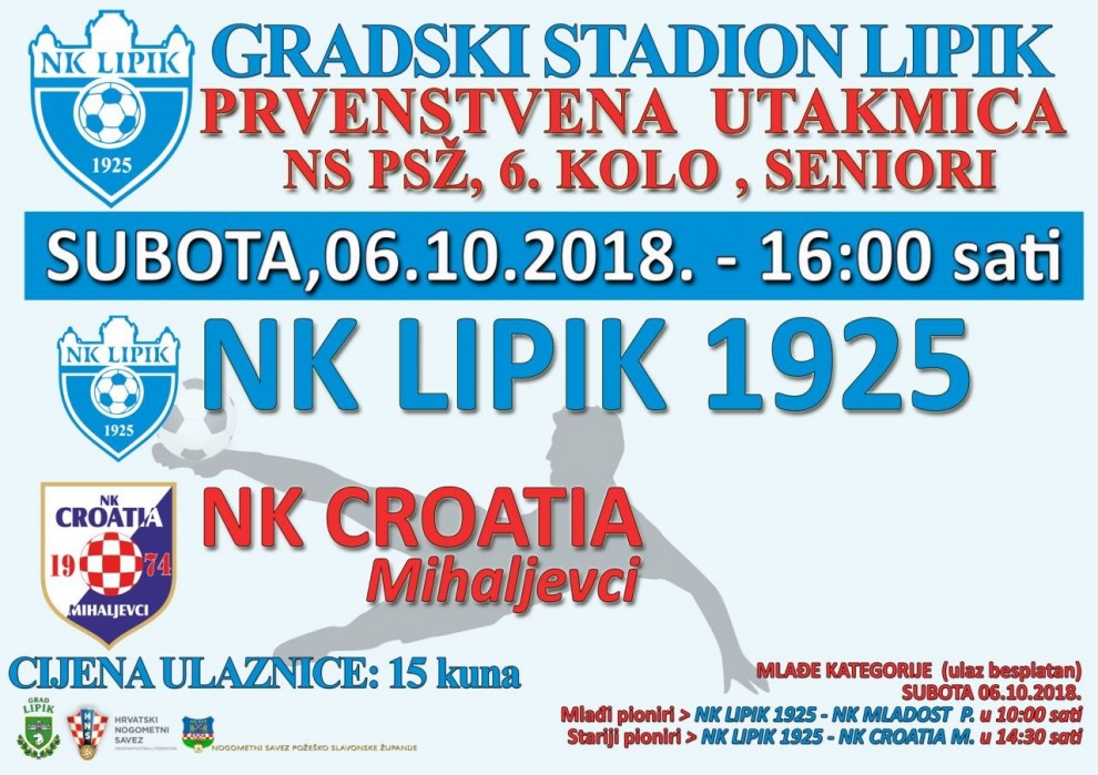 Nogometni stadion u Lipiku, u subotu će biti mjesto održavanja utakmice šestog kola prve županijske nogometne lige. Početak utakmice je u 16 sati, a našim nogometašima u goste stiže Croatia iz Mihaljevaca koja je u prošlom kolu svladala vrlo dobru momčad iz Buka s 2-0. Lipičani su slavili na gostovanju u Jakšiću s visokih 3-0 tako da se može očekivati dobra utakmica.