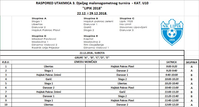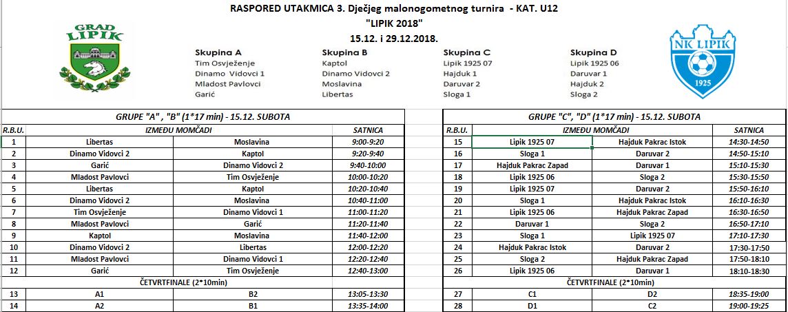 Prvi će na teren izaći mlađi pioniri (U-12), u subotu 15. prosinca. Domaće momčadi NK LIPIK 1925 nastupit će u popodnevnom terminu od 14:30 sati pa sve do 18:30 sati kad se očekuju četvrtfinalne utakmice.