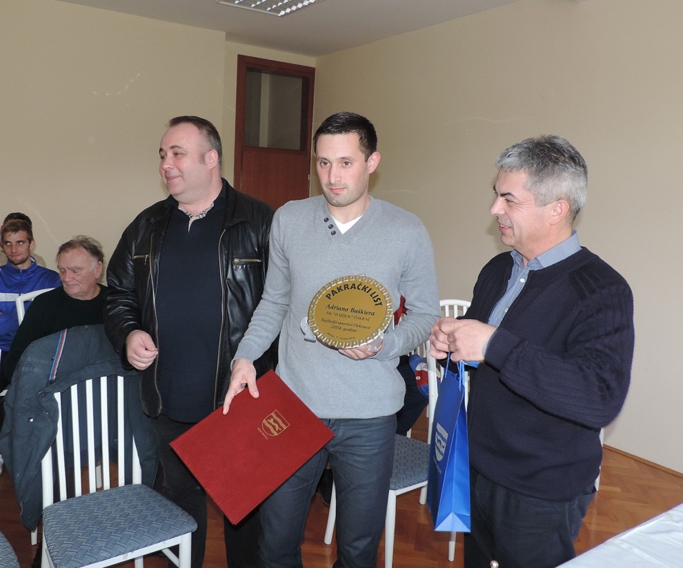 Najboljem sportašu Grada Pakraca u 2014. godini Adrianu Baškieri 17. ožujka u dvorani Hotela Pakrac pred okupljenim sportskim djelatnicima i istaknutim sportašima Pakraca gradonačelnik Pakraca Davor Huška, predsjednik Gradskog vijeća Zoran Krejči i dogradonačelnica Pakraca za društvene djelatnosti Anamarija Blažević uručili su plaketu i prigodni poklon te po prvi puta simboličnu novčanu nagradu.