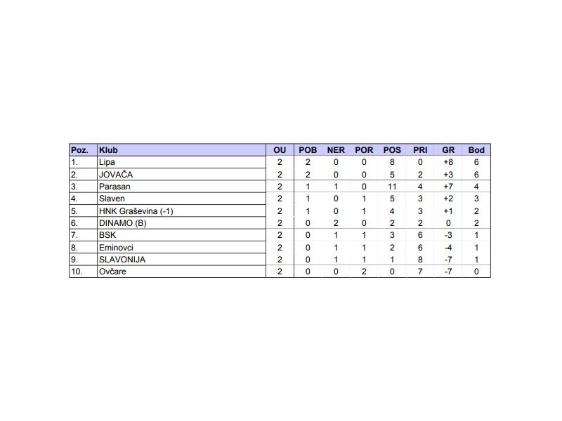 U drugoj županijskoj nogometnoj ligi Jovača nastavlja s dobrom igrom, a ovaj puta su svladali goste iz Gradca s 3-2 (Mioković, Strganac, Lengelić). Lokalni derbi između Slavonije i Dinama iz Badljevine završio je neodlučenim rezultatom 0-0. Jovača je sa šest bodova na drugom mjestu s istim brojem bodova kao i prvoplasirana Lipa, dok je Dinamo šesti s dva boda, a Slavonija je na devetom mjestu s jednim bodom.