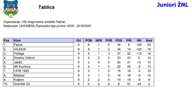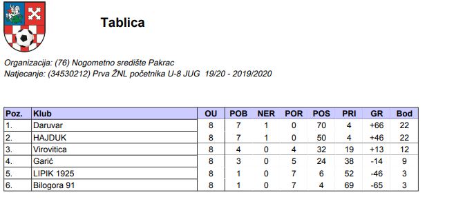 Početnici (U-10) zauzimaju deveto mjesto od ukupnih 11 klubova u 1.ŽNL PSŽ. Ukupno su odigrali 10 utakmica, od čega imaju tri pobjede, jednu neriješenu i šest poraza.