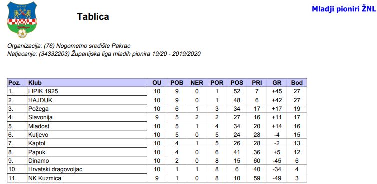Mlađi pioniri (U-12) su jesenski prvaci 1.ŽNL PSŽ. U 10 utakmica upisali su 9 pobjeda i jedan poraz te postigli 52, a primili 7 zgoditaka.