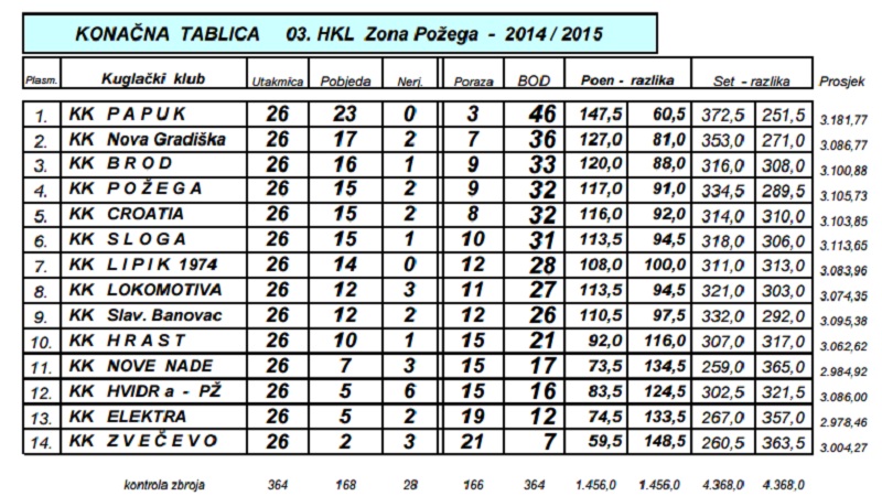 Završeno je natjecanje u sezoni 2014./2015. 3. Hrvatske kuglačke lige-zona Požega sa susretima 26. kola odigranim od 10. do 13.travnja u kojima su Papuk iz Pakraca i Sloga iz Prekopakre ostvarili pobjede, a Lipik 1974 i Slavonski banovac iz Pakraca su poraženi. Za igrača posljednjeg kola lige proglašen je Ilija Turković ml. iz Papuka koji je srušio 572 čunja.