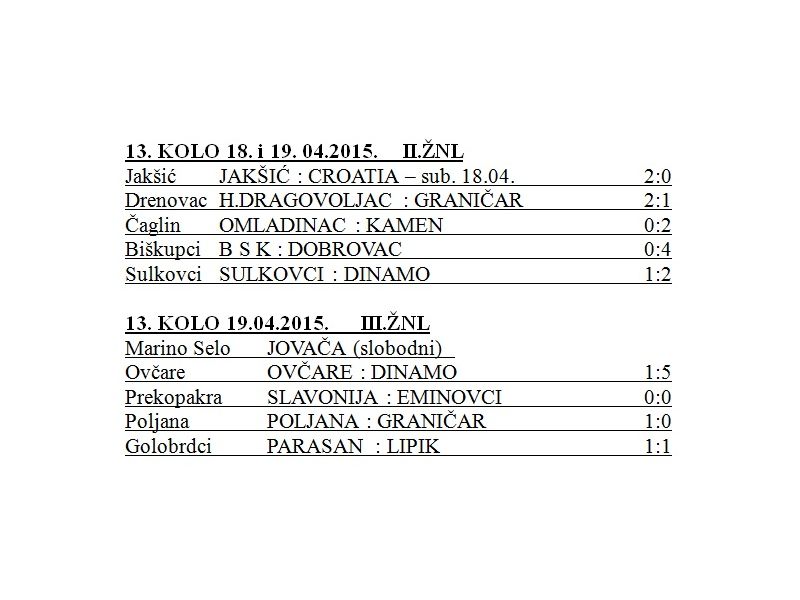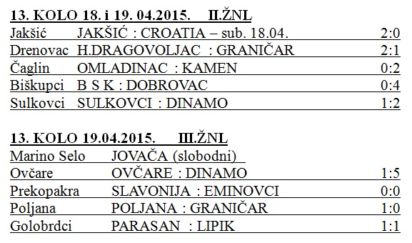 Susreti 13. kola 2. i 3. ŽNL Požeško-slavonske odigrani 18. i 19. travnja donijeli su pobjedu nogometaša iz Dobrovca u Biškupcima (4:0) i poraz NK „Croatia“ Donje Obriježi u Jakšiću (2:0). NK „Dinamo“ Badljevina pobijedio je u Ovčarama (5:1), NK „Poljana“ kod kuće je pobijedila goste iz Eminovaca (1:0), a NK „Slavonija“ odigrala je neodlučeno s NK „Graničar“ u Prekopakri (0:0) i NK „Lipik 1925“ u Golobrdcima od NK „Parasan“ također je remizirao (1:1).