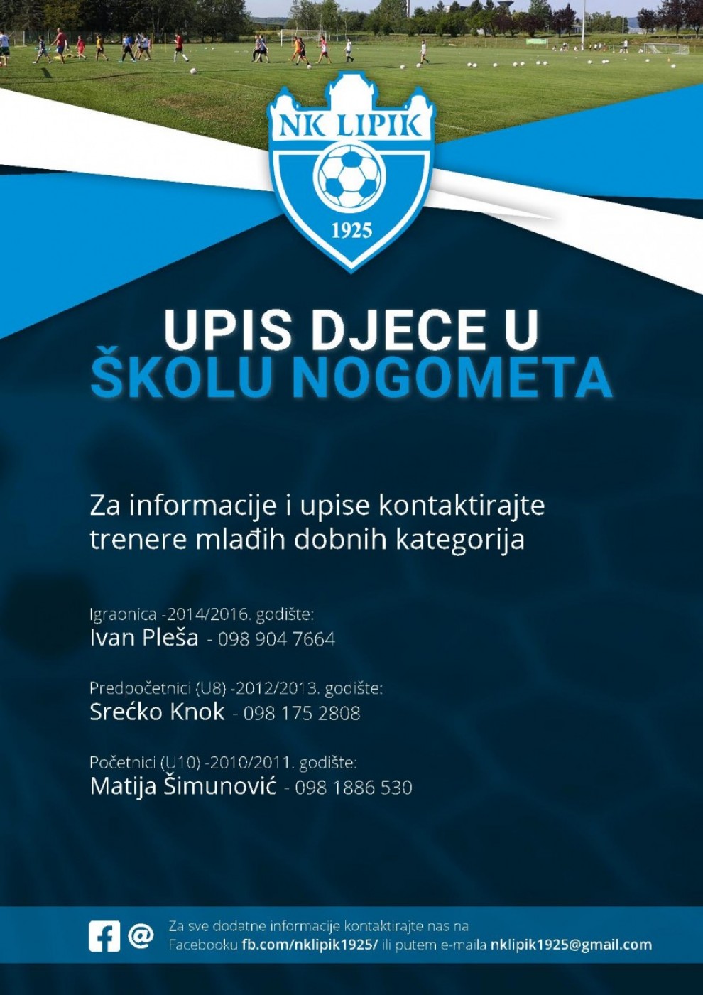 Nogometni klub Lipik 1925 poziva sve zainteresirane roditelje da upišu svoje dječake i djevojčice u Školu nogometa NK Lipik 1925 za nadolazeću natjecateljsku sezonu 2020./2021.