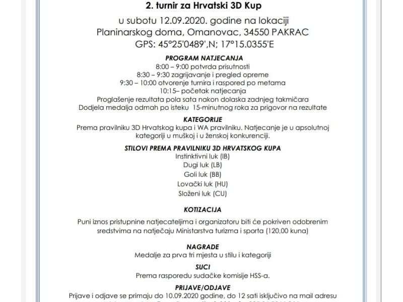 Natjecanje će se provoditi sukladno pravilniku Hrvatskog 3D kupa i WA pravilniku u apsolutnoj kategoriji u muškoj i ženskoj konkurenciji, a stilovi uključuju Instinktivni luk (IB), Dugi luk (LB), Goli luk (BB), Lovački luk (HU), Složeni luk (CU).