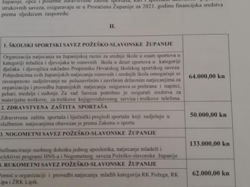 Naime Program javnih potreba u sportu Požeško-slavonske županije za 2021. sa svrhom poticanja i promicanja sporta, provođenja programa tjelesne i zdravstvene kulture djece i mladeži predviđa 62.000 kuna za Rukometni savez Požeško-slavonske županije i kako precizno piše, „Pomoć u organizaciji i provedbi natjecanja mlađih kategorija RK Požega, RK Lipa i ŽRK Lipik“.