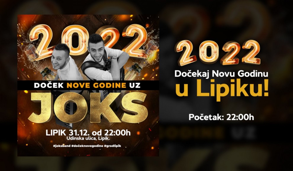 Tradicionalni doček nove godine u Lipiku održava se na otvorenom, kod Tržnice u Udinskoj ulici od 22 sata - uz poznate zvuke grupe JOKS BAND, ugostiteljsku ponudu, grijane punktove i ponoćni vatromet.