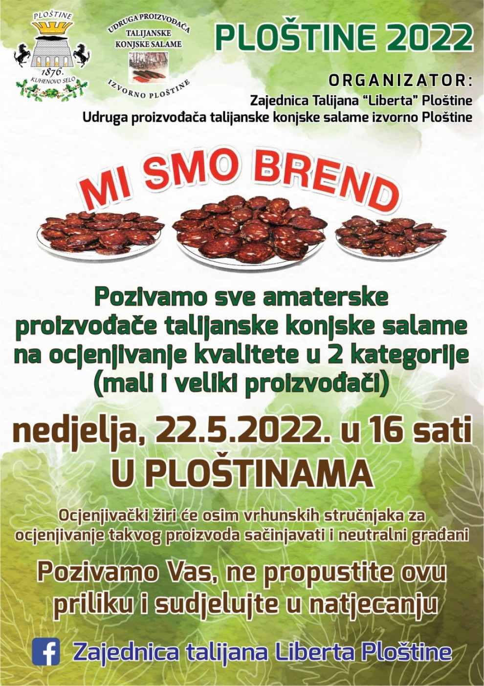 Zajednica Talijana Liberta Ploštine u suradnji s Udrugom proizvođača talijanske konjske salame izvorno Ploštine u nedjelju, 22. svibnja s početkom u 16 sati organizira natjecanje proizvođača talijanske konjske salame.