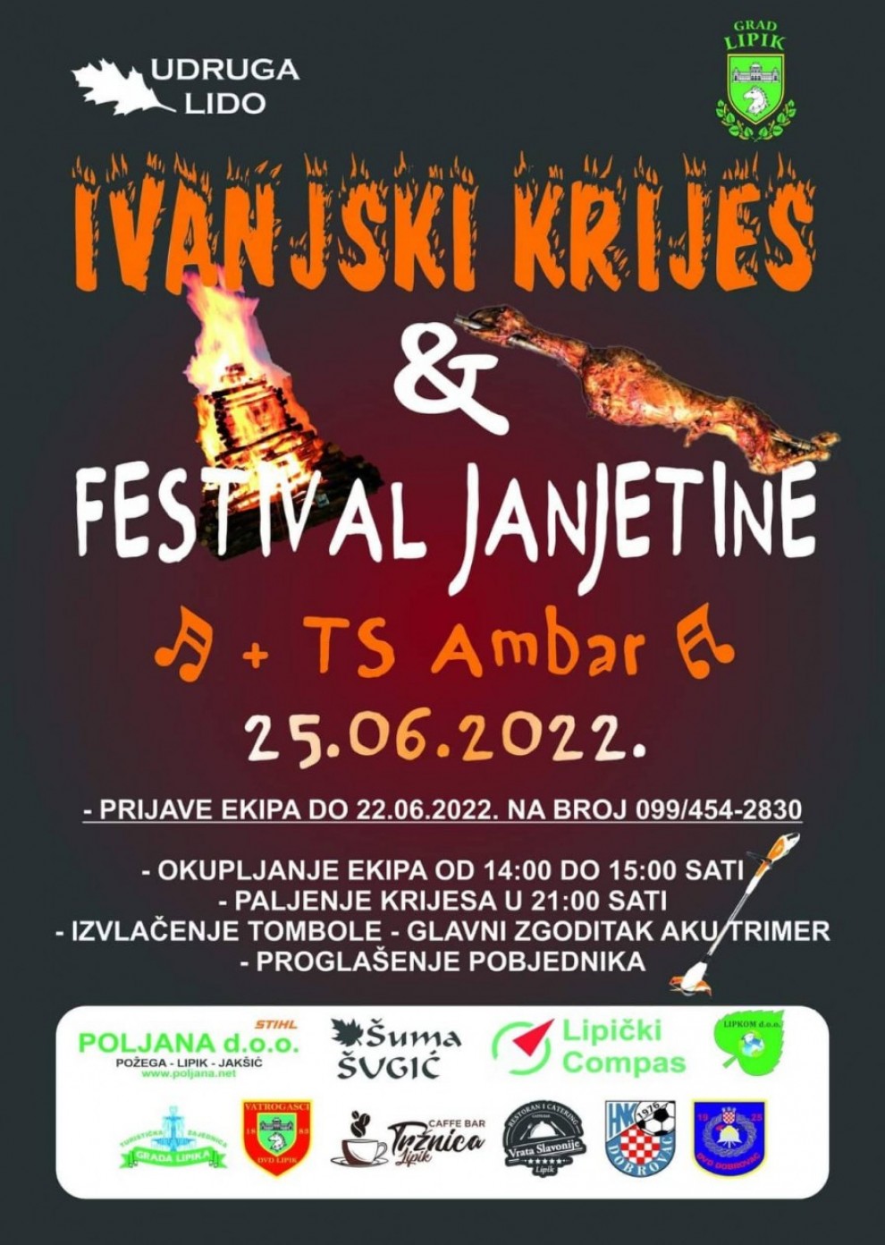 Kao što smo ranije već najavili, u organizaciji Udruge za očuvanje narodnih običaja LIDO, a pod pokroviteljstvom Grada Lipika, u subotu, 25. lipnja održat će se tradicionalni Ivanjski krijesovi na igralištu NK Dobrovca.