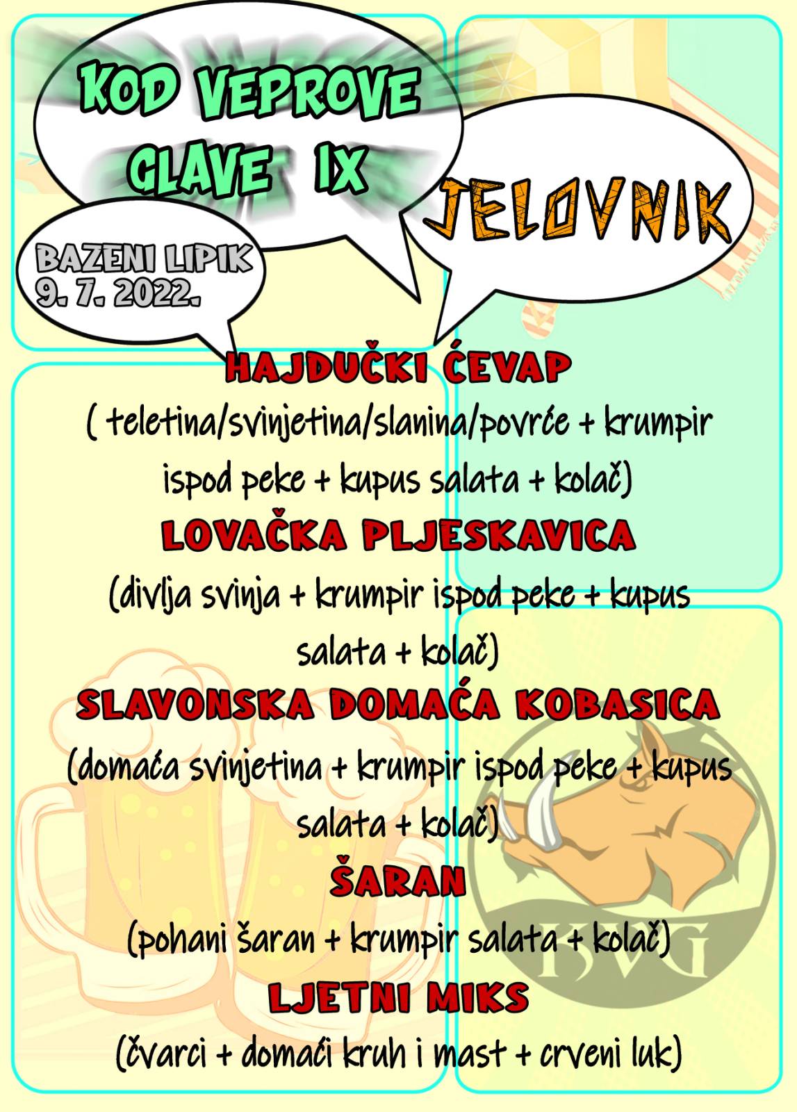 Ekipa Povijesnog društva Pakrac - Lipik već je ranije najavila otvaranje svoje nadaleko poznate krčme čiji će jelovnik zasigurno zadovoljiti svako nepce koje se ove ljetne srpanjske subote zatekne na bazenima.
