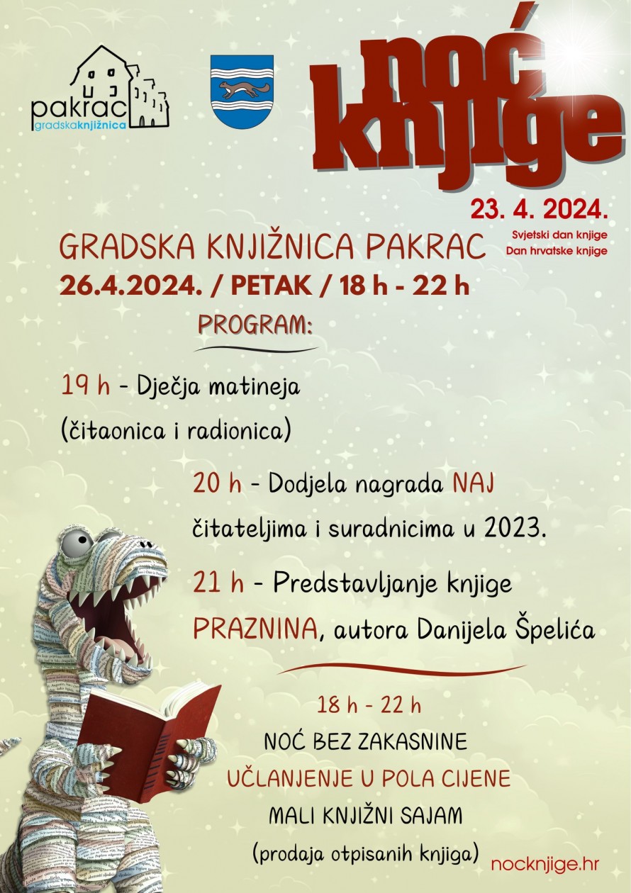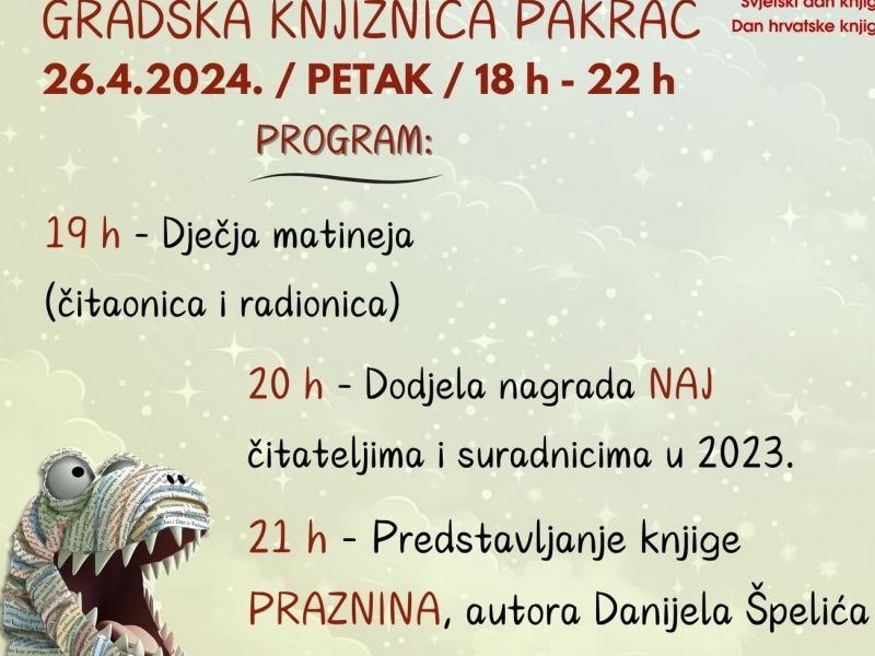 Gradska knjižnica Pakrac također će sudjelovati u Noći knjige, iako će program biti održan u petak, 26. travnja. Ravnateljica Monika Lucić Fider ističe da će druženje trajati od 18 do 22 sata, obogaćeno dječjom čitaonicom, radionicom te predstavljanjem najnovije knjige Pakračanina Danijela Špelića.