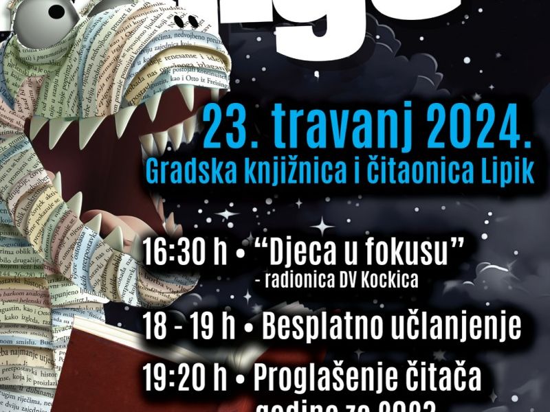 Gradska knjižnica i čitaonica Lipik priprema bogat program za Lipičane. Ravnateljica Jasna Molnar najavljuje da će Multikulturalni centar biti poprište raznih događanja već danas, od 16:30 sati, s radionicom "Djeca u fokusu" koju organizira DV Kockica. U 18 sati bit će organizirano simbolično besplatno učlanjenje u knjižnicu, a u 19 sati slijedi proglašenje čitača godine za 2023.