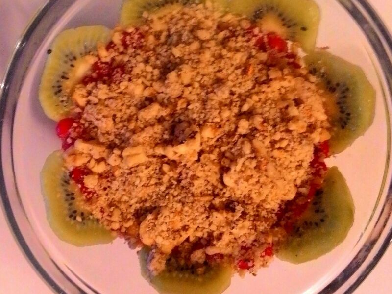 Prije početka izrade pudinga, stavite chia sjemenke u vodu, kako bi se natopile, nabubrile te dale onu finu gustoću. Kiwi ogulite te narežite na ploške te iste te ploške još prerežite po pola, kako bi bile spremne za dekoriranje, kao i mandarinu ili naranču koju ogulite te pripremite za dekoriranje. Dio oraha sameljite u brašno, a dio sitno nasjeckajte za dekoriranje.