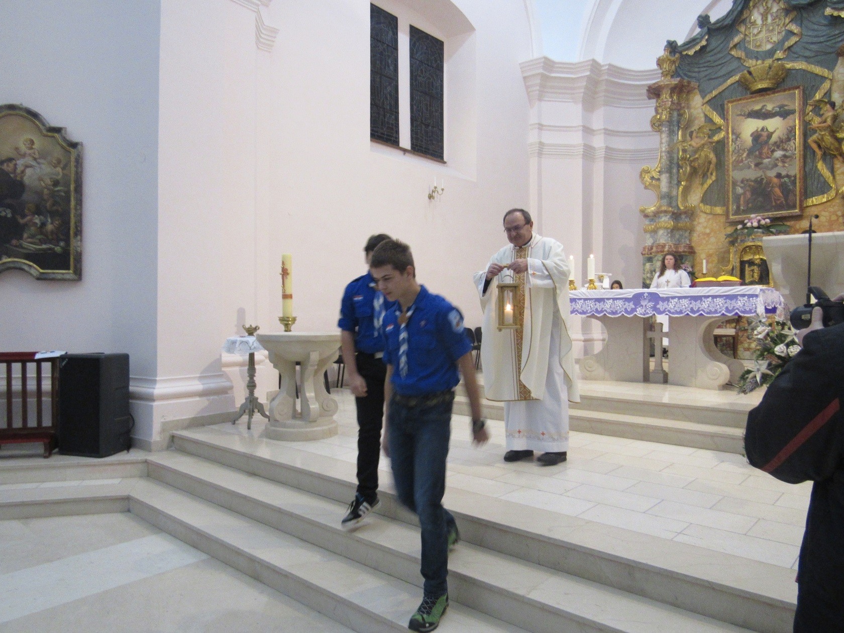 Članovi Odreda izviđača Pakra Luka Feher i Josip Robotka su 14. prosinca na misu zornicu donijeli Betlehemsko svjetlo mira u crkvu Uznesenja Blažene Djevice Marije u Pakracu.