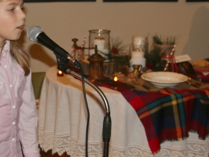 Kad se obitelj okupi za blagdanskim stolom na Božić to se uobičajeno odvija uz božićne pjesme pa je tako druženje uz prekrasno urešenih devet stolova započelo uz pjesme „Kirie eleison“ i „Djetešce nam se rodilo“ koje je otpjevala učenica Osnovne glazbene škole „Pakrac“ Staša Kukić u pratnji profesorice Kornelije Boršodi na glasoviru.