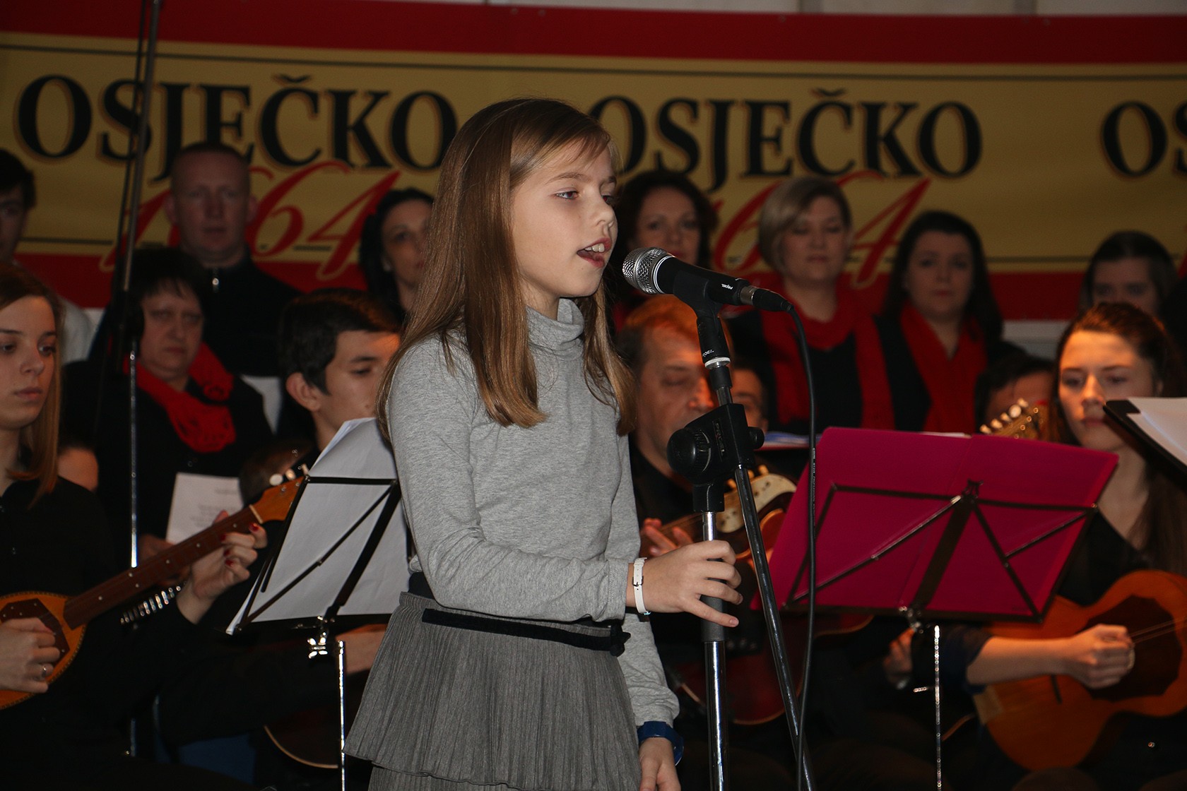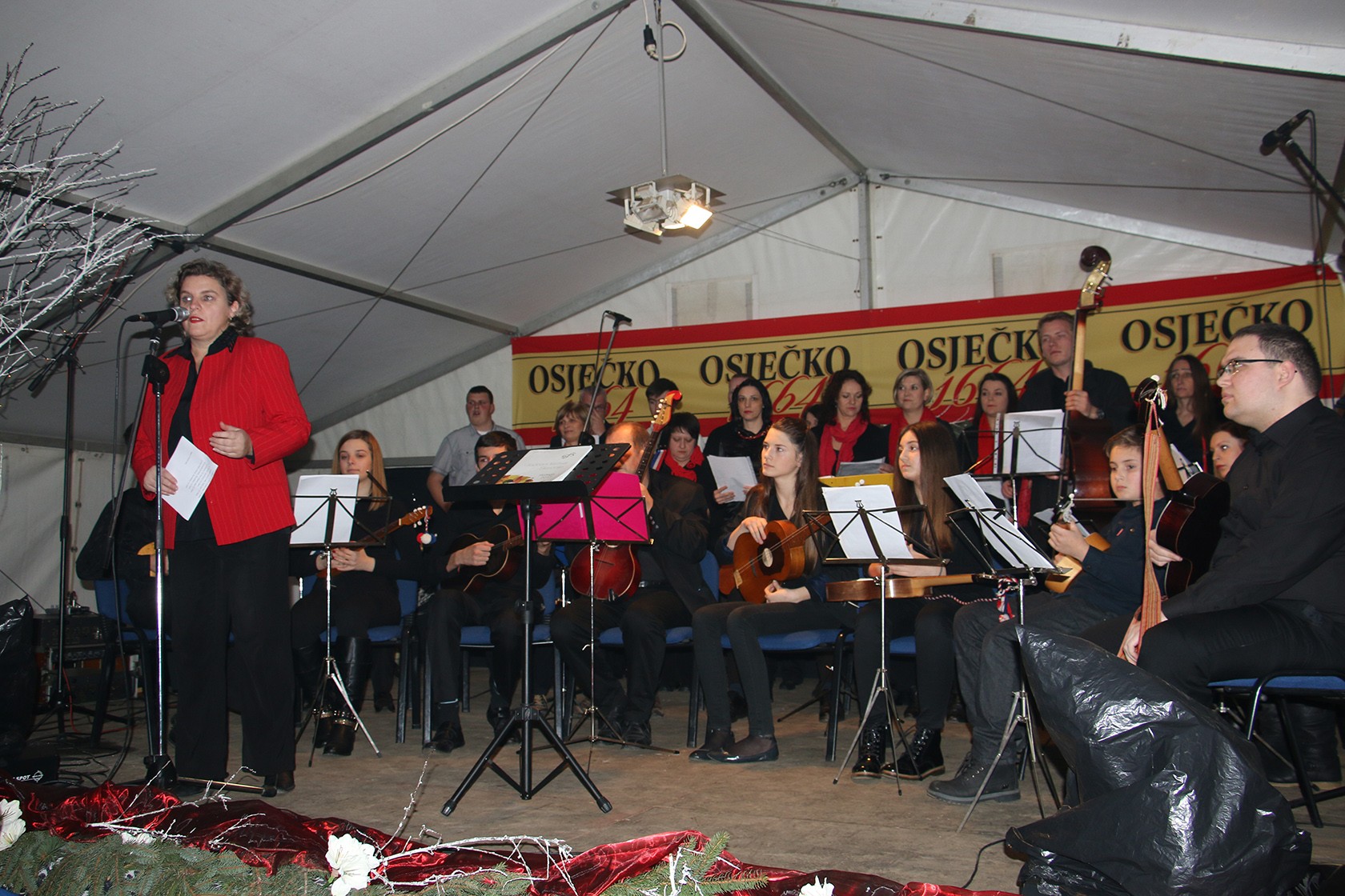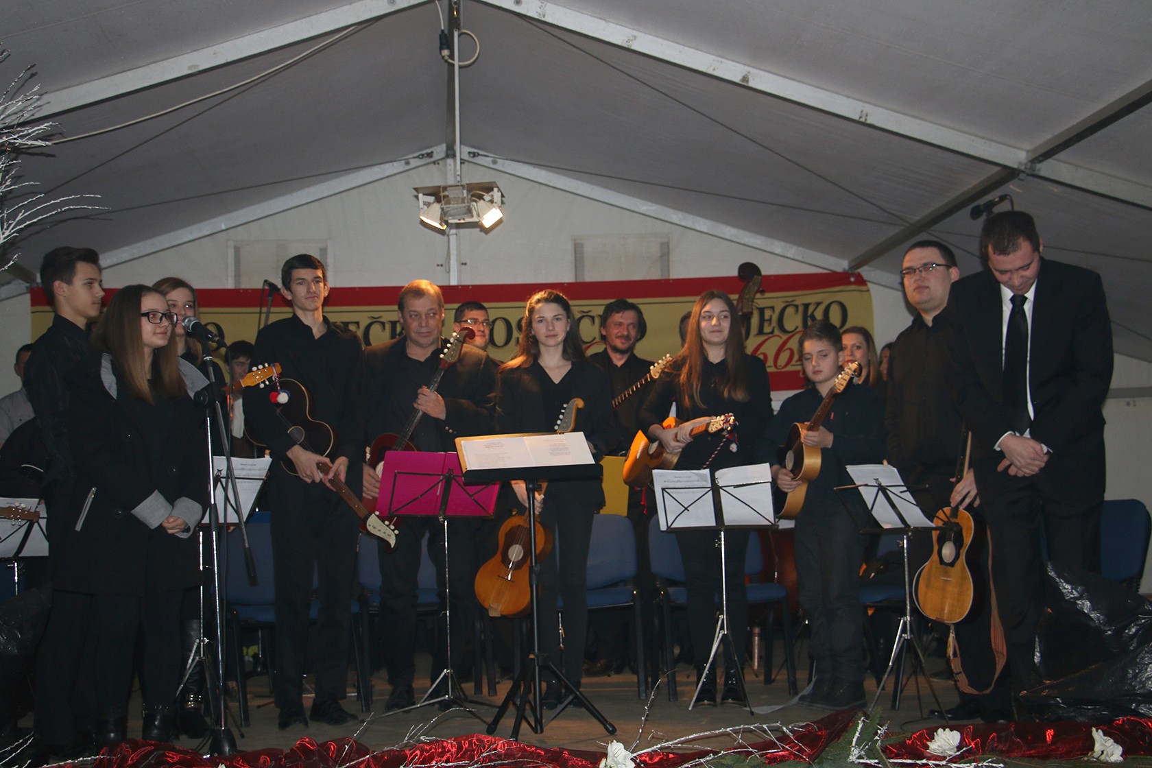 Predsjednica Tamburaškog orkestra „Pakrac“ Alfreda Petani-Grafina pozdravila je sve okupljene čestitavši Božić i poželjevši sve najbolje u novoj 2016. godini prije početka prvog božićnog i prvog koncerta uopće, kako je istaknula, od osnutka orkestra 30. rujna ove godine te okupljanja članova tijekom listopada. Voditelj i dirigent orkestra, koji broji 17 članova, Tomislav Galić također se pridružio čestitkama, a zatim su počeli s izvedbom prve tradicionalne božične pjesme uz pratnju Vokalne skupine KUD-a „Seljačka sloga“ iz Prekopakre koja se tijekom ostatka koncerta izmjenjivala sa solisticama Stašom Kukić i Anom Kobetić.