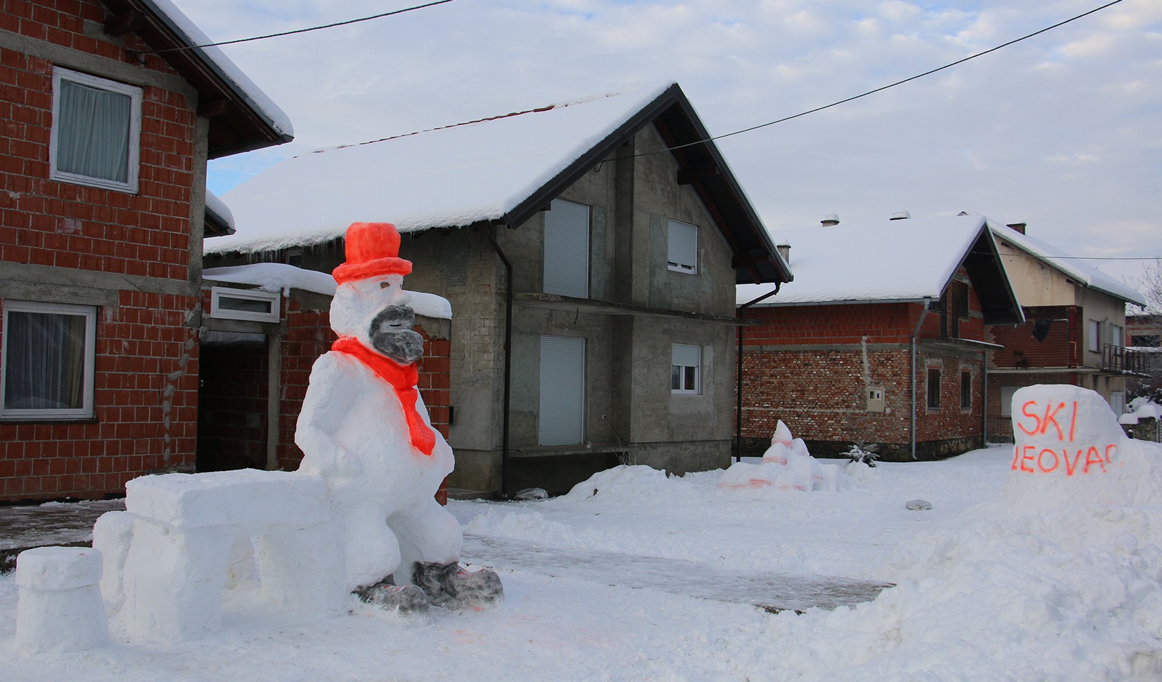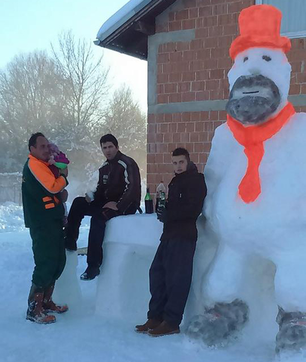 Snjegovića iz Dakić sokaka visokog 3,10 metara ispred kuće susjeda Miroslava Leovca podigli su zajedno Vjeko Tomić, Donis Komšić te Matej i Petar Grgić prema zamisli i kreaciji Miroslava Leovca. Dakako pri izradi snjegovića sudjelovala su i brojna djeca iz susjedstva koje je ova treća figura u malom snježnom parku najviše obradovala. Od Miroslava smo doznali kako snjegović predstavlja Djeda Božićnjaka koji se odmara na velikoj klupi, a ovu ideju on nije prvi put ove zime realizirao nego je i unazad prethodnih nekoliko godina izrađivao snjegovića po ovom obliku, ali u manjoj dimenziji. Tako sada uz mali ledeni dvorac, mini ski-centar za djecu sjedi i veliki Djed Božićnjak kraj kojega se može sjesti jer je pored klupe na kojoj se odmara izrađeno i par stolica od snijega.