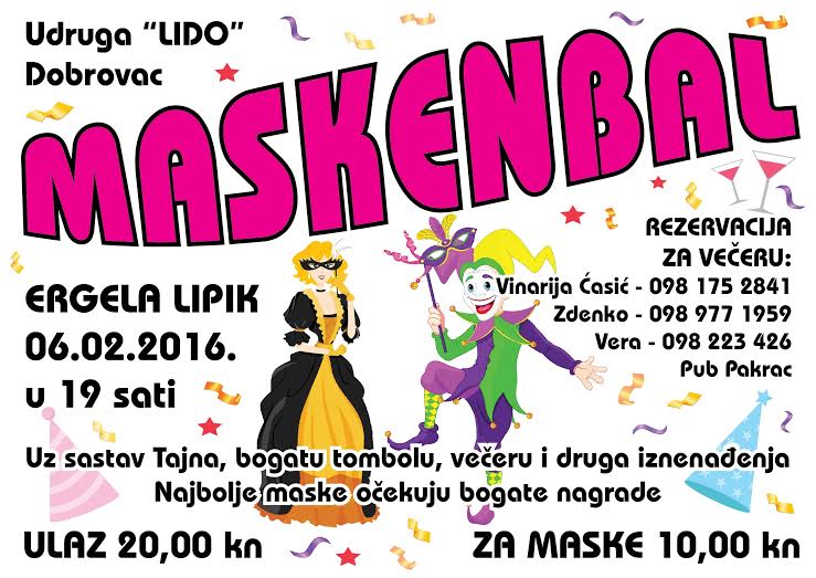 Tradicionalni 9. maskenbal Udruge LIDO počinje u 19 sati 6. veljače 2016. godine u restoranu na ergeli u Lipiku. Maškare će cijelu večer zabavljati glazbeni sastav „Tajna“, a uz bogatu tombolu, večeru i druga iznenađenja najbolje maske očekuju bogate nagrade. Za nemaskirane ulaznica je 20 kuna, a za maskirane 10 kuna. Rezervirati večeru može se na brojeve telefona: 098 175 2841 (Vinarija Ćasić), 098 977 1959 - Zdenko Poletto, 098 223 426 - Vera Milić ili u caffe baru „Pub“ u Pakracu kod Saše Poletta.
