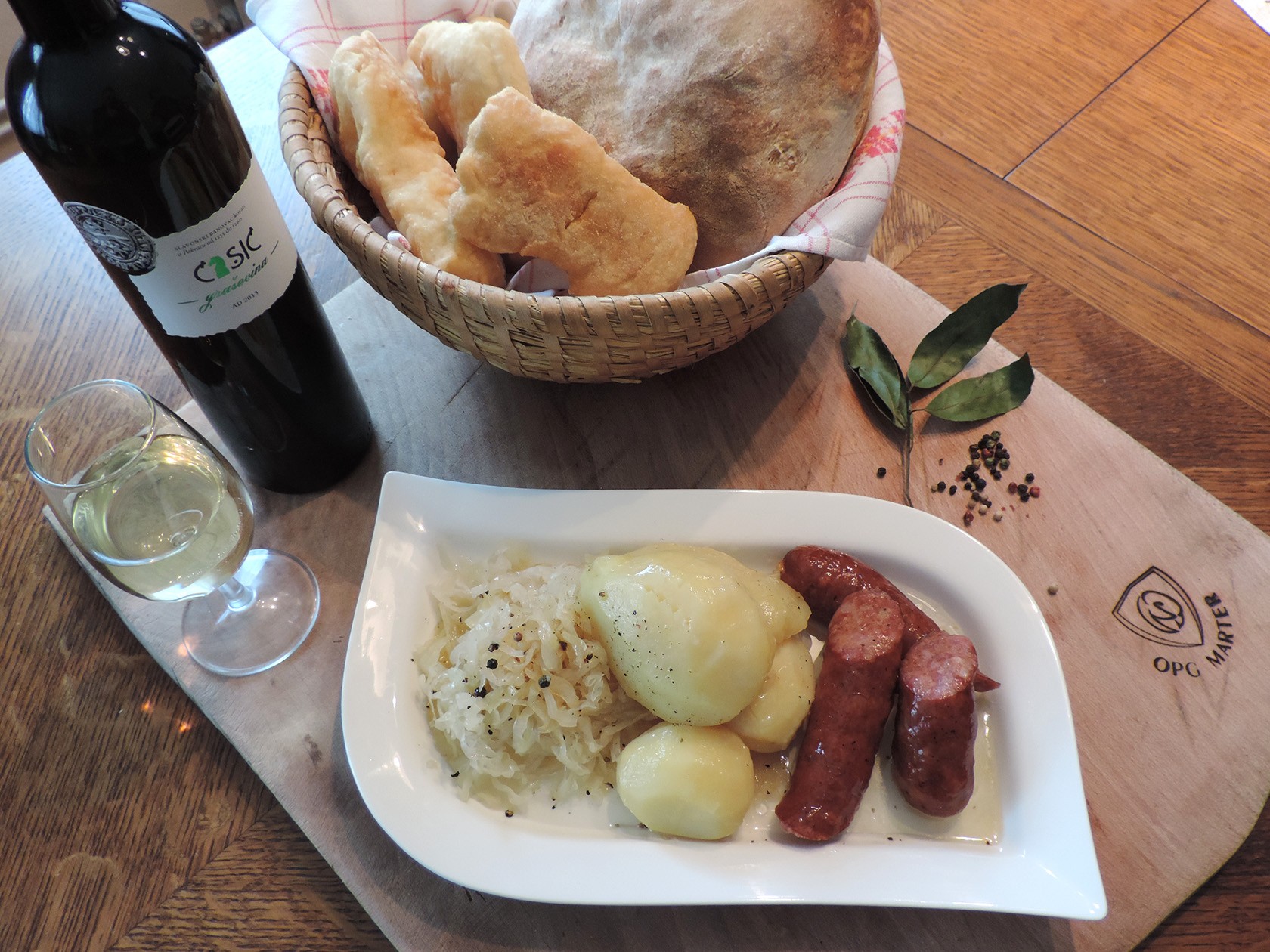 Priprema: Glavicu kupusa operite i isjecite na rezance ( ne pretanko) , suho meso narežite na manje komade i isto operite u mlakoj vodi. Lonac za kuhanje namažite iznutra sa svinjskom masti . Na dno lonca stavite prvo red kupusa pa red mesa i začine i tako ponovite ali ne do samog vrha lonca. Sve skupa zalijte vrućom vodom 2 cm iznad zadnjeg reda. Kuhajte na umjerenoj vatri lagano oko 2 sata. Cijele krumpire možete skuhati u slanoj vodi posebno ali i staviti zajedno sa kupu som (po želji). Servirajte po mogućnosti sa toplim kruhom iz krušne peći ili domaćom pogačom. Užitak u ovom jelu upotpuniće svakako čaša vrhunske graševine Ćasić.