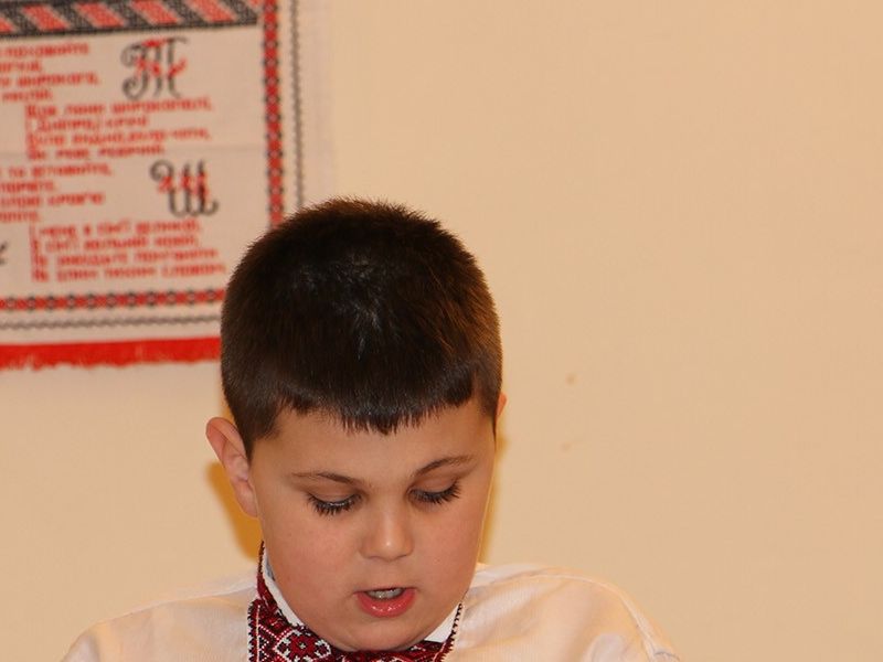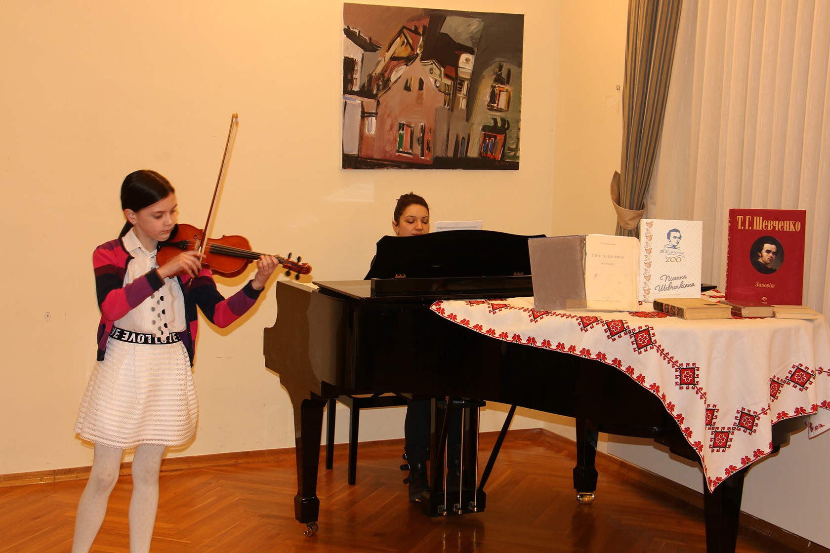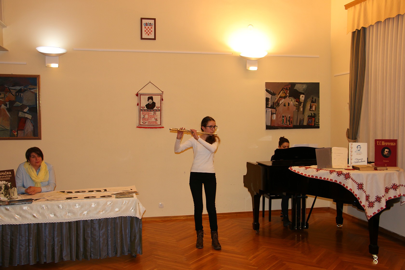 U glazbenom dijelu večeri po tri glazbena djela izvele su učenice uz pratnju učiteljice iz Osnovne glazbene škole „Boris Papandopulo“ Kutina. Nastupile su Inga Potnar s violinom te Antonija Karadža i Margareta Andrić s flautom uz korepeticiju profesorice Marije Esih na glasoviru. Djela utemeljitelja moderne ukrajinske književnosti Tarasa Ševčenka recitirali su Irina Matijević, prof. Oksana Schneider iz Kutine i Kristian Matijević. Najmlađi recitator Kristian Matijević pročitao je okupljenima Ševčenkovu pjesmu Oporuka koju je pjesnik napisao 1845. godine, 16 godina prije smrti, a ta pjesma ima posebno značenje za ukrajinsku kulturu i književnost jer njene stihove gotovo svaka ukrajinska obitelj ima na zidu u svojem domu. Inače, Taras Ševčenko rođen u kmetskoj obitelji za života je ostao kmet i morao je uvijek raditi za svog gospodara, a ukidanje kmetstva u Ukrajini koje bi mu donijelo slobodu nije doživo.