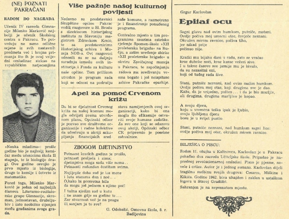 U prvom broju Pakračkog vjesnika iz srpnja 1971. godine objavljen je članak o najboljem učeniku Školskog centra u Pakracu, tada još (ne)poznatom Pakračaninu koji je tijekom četiri godine uz odlične ocjene iz svih nastavnih predmeta stekao brojna priznanja i nagrade na republičkim školskim natjecanjima. Kao gimnazijalac u trećem razredu na republičkim natjecanjima u tadašnjoj državi „Nauka mladima“ bio je najbolji kemičar među učenicima škola 2. stupnja i drugi na natjecanju iz biologije. Nastavio je s uspjesima i u četvrtom razredu, bio je prvi iz biologije, drugi iz kemije i četvrti iz matematike. Tijekom školovanja u Pakracu bio je i jedan od najboljih članova Literarno-recitatorske grupe Gimnazije. Novinari iz redakcije Pakračkog vjesnika članak su zaključili riječima „…skroman, jednostavan, druželjubiv i zato neobično cijenjen među građanima svoga grada.“