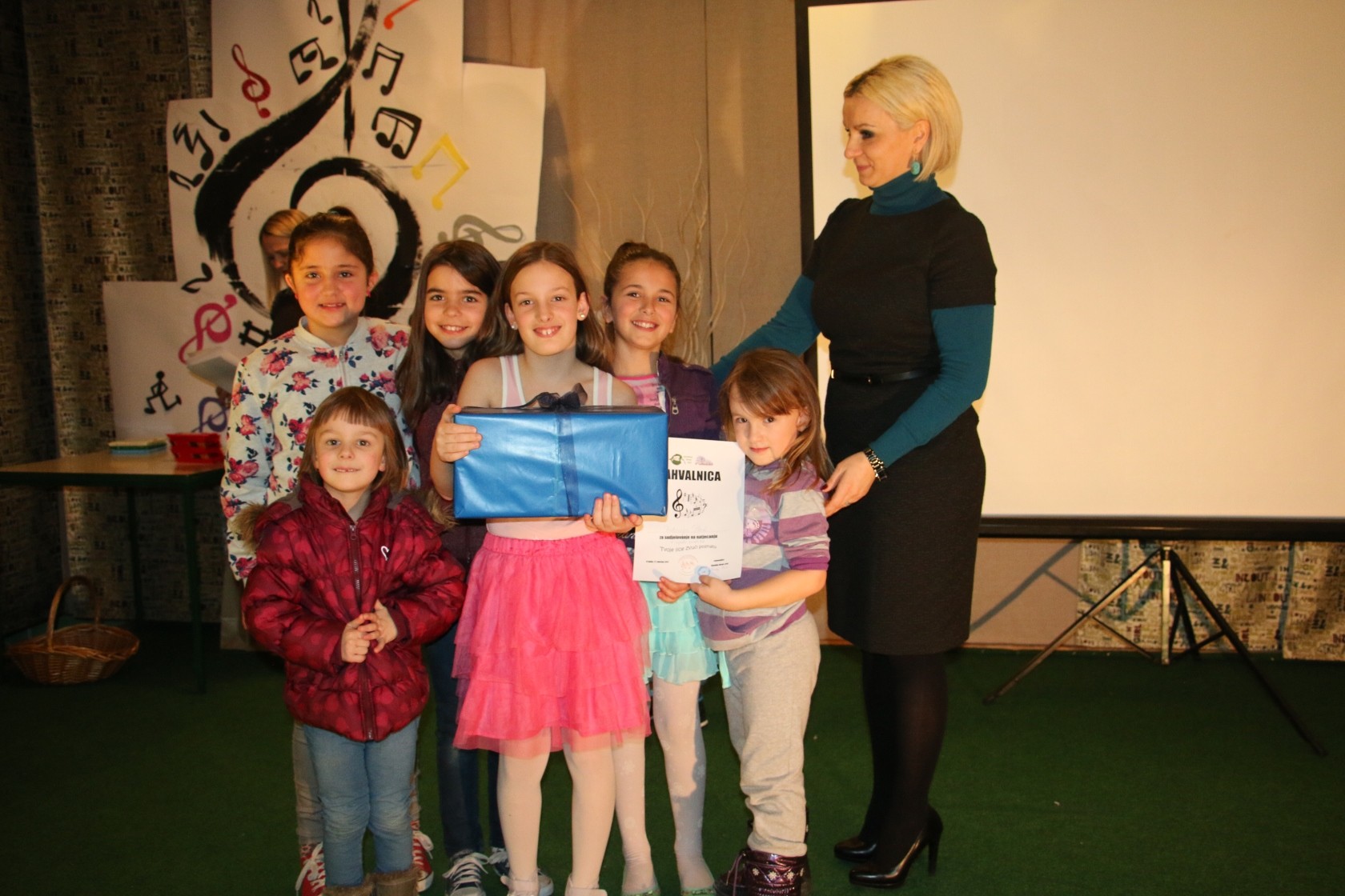 Prije proglašenja pobjednika sve okupljene pozdravila je ravnateljica škole Klaudija Kovač koja je istaknula kako su glazbenim showom "Tvoje lice zvuči poznato" u školi objedinili Dan smijeha, Dan zagrljaja i apel protiv nasilja pod krilaticom "Smijeh je lijek-Izbacimo nasilje zauvijek!" te na taj način kroz izražavanje talenata i kreativnosti željeli svima poslati poruku nenasilja. Sve s ciljem borbe protiv vršnjačkog nasilja. Male talentirane izvođače i sve koji su sudjelovali u organizaciji potom je pohvalio gradonačelnik Vinko Kasana.