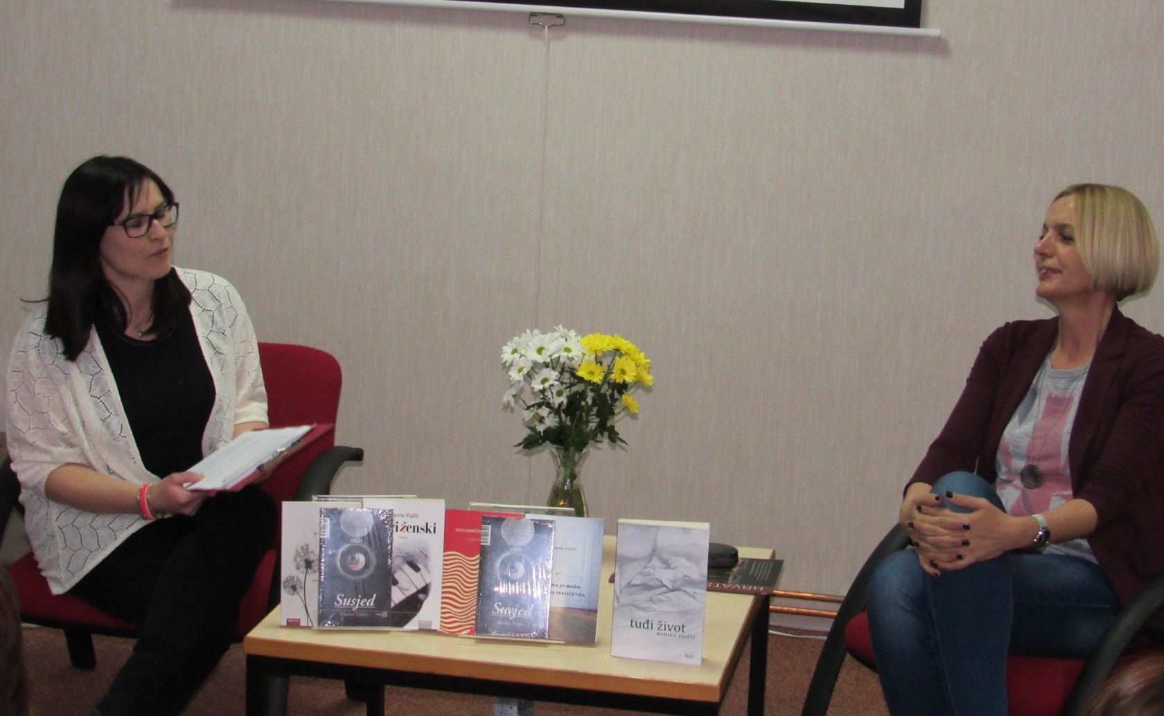 Razgovor s trenutno jednom od popularnijih književnica među hrvatskom čitateljskom publikom ravnateljica Monika Lucić-Fider započela pitanjima o nagradi VBZ-a i TISAKmedije koju je Martina Vujčić dobila 2015. za najbolji neobjavljeni roman „Susjed“ nakon čega je cjelokupna hrvatska javnost, ne samo čitalačka, se više upoznala s djelima autorice. Uz ovu književnu nagradu književnici se nagrađuju i pozamašnim novčanim iznosom. Potom je uslijedio razgovor o samom romanu „Susjed“ te o romanu „Otpusno pismo“ koji je objavljen dva mjeseca ranije prije nagrađenog romana „Susjed“, a napisan je u koautorstvu s Ivicom Ivaniševićem. Ovaj roman napisan je kao razmjena pisama između dvoje glavnih likova, vršnjaka Irene i Ignjata koji se dopisuju 30 godina nakon završene mature. Pritom je pisma za lik Irene napisala autorica, a pisma za lik Ignjata Ivica Ivanišević. Dva pisma iz romana tijekom književne večeri pročitale su Sanja Delač, od Irene, i Mirsada Madžarević, od Ignjata, čitateljice uključene u rad književnog kluba Gradske knjižnice Pakrac. Također je bilo riječi o debitantskom romanu „Tuđi život“. „To je priručnik s uputama za one koji se odluče promijeniti svoj život i krenuti ispočetka, promijeniti ženu, grad, auto… da znaju što ne trebaju činiti pri tome.“, rekla je autorica za roman „A onda je Božo krenuo ispočetka“. Prije rastanka Marina Vujčić publici je pročitala jedan ulomak iz romana koji će tek biti objavljen na jesen ove godine. Glavni lik romana je gosp. Bauer, udovac u 50-im godinama, koji preko oglasa u novinama traži žensku osobu za milovanje po leđima jer mu nakon što mu je preminula žena najviše nedostaje ženska ruka na njegovim leđima. U pročitanom ulomku okupljena publika doznala kako je protekao susret između glavnog junaka i jedne kandidatkinje koja se javila na oglas, a što se dalje dogodilo morat će pričekati objavljivanje romana…