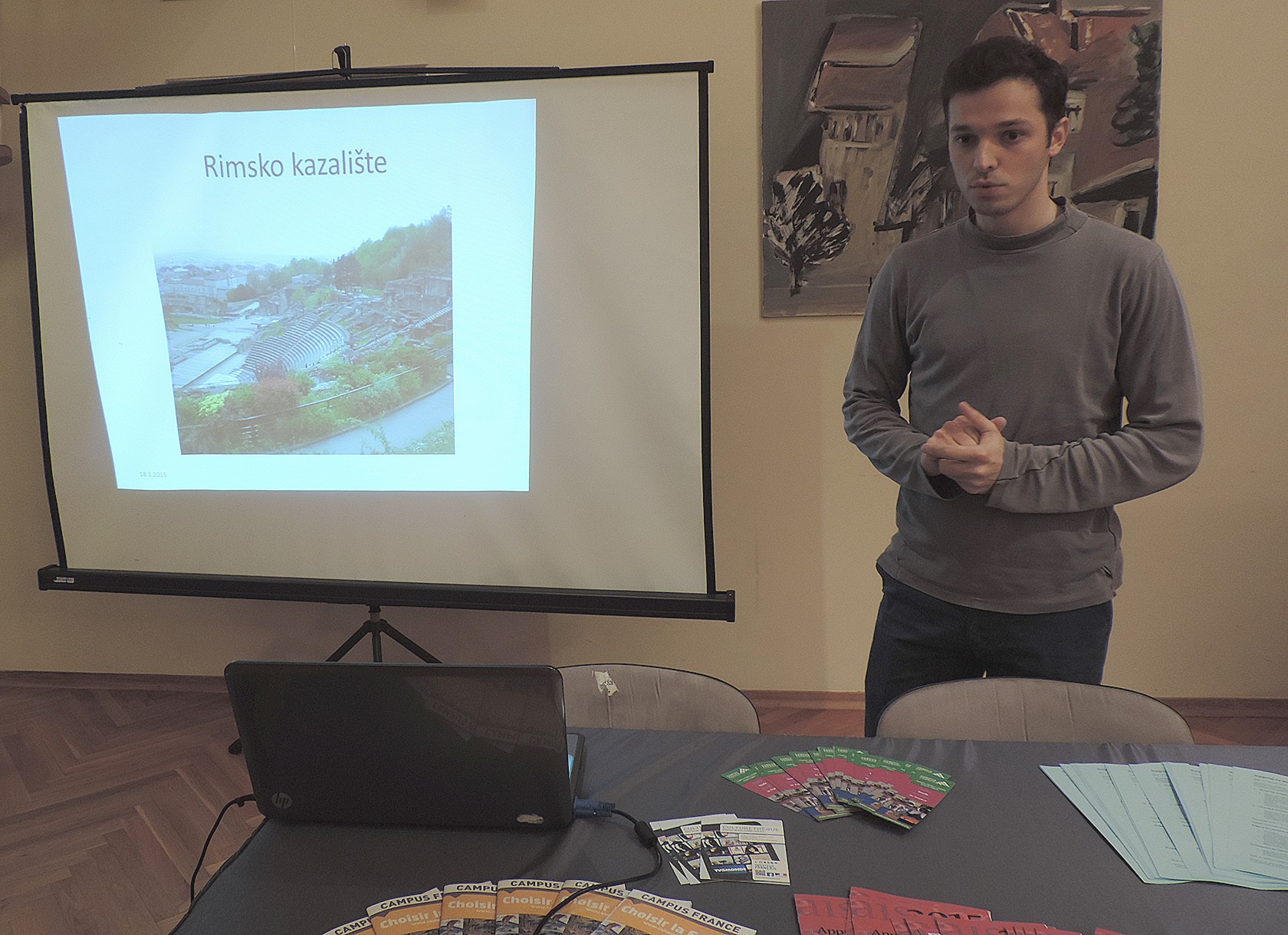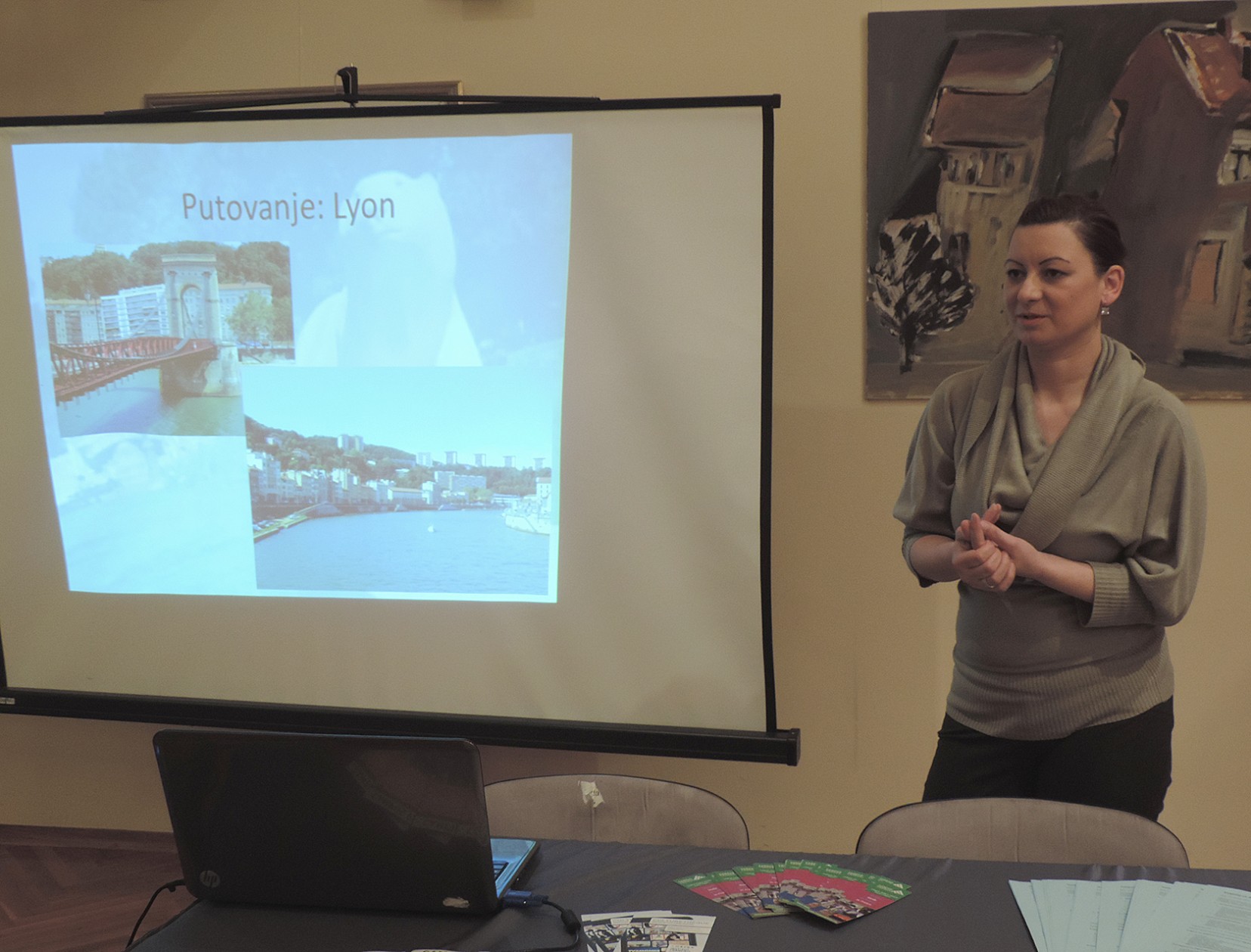 Jacqueline Ivezić predstavila je prvu govornicu, Anu Glavaš iz Nove Gradiške, diplomiranu prehrambenu tehnologinju koja je dobila stipendiju Vlade Republike Francuske za tromjesečno istraživanje u francuskom agronomskom institutu u okviru svog postdiplomskog studija. Ana je još za vrijeme svog redovitog školovanja započela učiti francuski jezik, a za prijavu na stipendiju odlučila se kako bi usavršila svoje govorenje i poznavanje jezika. Ivezić je na početku predavanja istaknula kako je francuski službeni jezik u 29 zemalja svijeta, a koristi se još u 7 zemalja, iz kojih mnogi ljudi odlaze na školovanje u Francusku pa tako tko se odluči na studij u toj zemlji ima priliku upoznati ljude s raznih strana svijeta i iz različitih kultura.