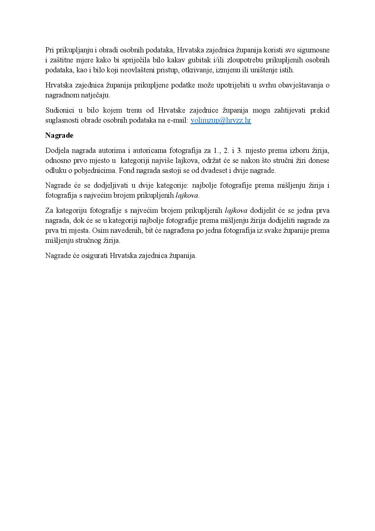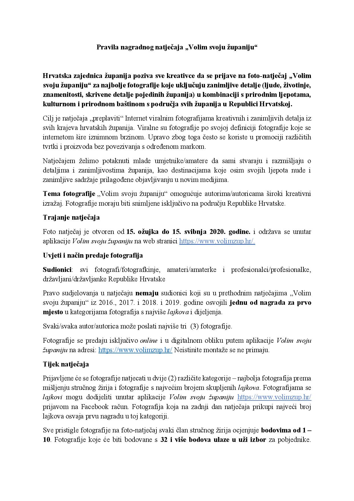 S obzirom na preporučenu izolaciju zbog borbe protiv koronavirusa, Hrvatska zajednica županija poziva sve amaterske i profesionalne ljubitelje fotografije da se pridržavaju propisanih mjera, te umjesto izlaska van, pregledaju postojeće fotogalerije te do 15. svibnja prijave najbolje fotografije na internetskoj adresi https://www.volimzup.hr/ kako bi u ovo teško vrijeme Internet preplavili lijepim fotografijama naših županija.