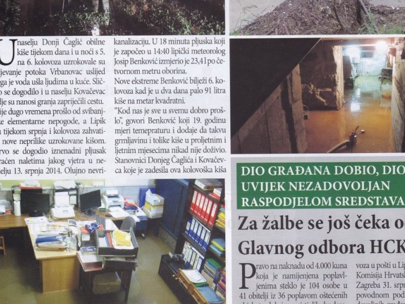 Bilo je i nemilih događaja poput poplave u Donjem Čagliću i Kovačevcu početkom kolovoza, kada su vatrogasci imali pune ruke posla s ispumpavanjima i uklanjanjem stabala koje je srušilo olujno nevrijeme. Mokar je to podsjetnik bio na obilne kiše koje su ranije iste godine na istoku Hrvatske prouzročile nezapamćene poplave u Gunji i Rajevom Selu. Tada još uvijek živ lipički meteorolog Stjepan Benković rekao je „Kod nas je sve u svemu dobro prošlo“ dodavši da u 19 godina mjerenja temperatura i padalina takvu grmljavinu i tolike kiše u proljetnim i ljetnim mjesecima nikad nije doživio.