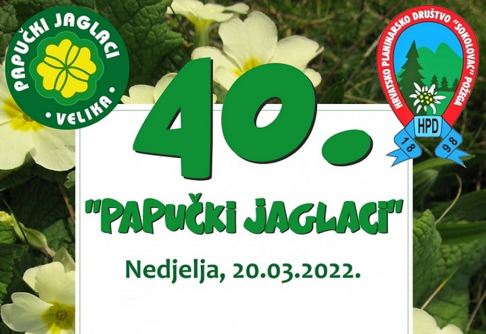 Jubilarno, 40.izdanje priče koja objedinjuje ljubav prema prirodi, autohtonim domaćim proizvodima i druženju tiskovnom su konferencijom najavili Bruno Horvat, predsjednik organizatora, HPD Sokolovac, Alen Jurenac, ravnatelj JU Park prirode Papuk, Tomislav Galić, direktor TZ Zlatni Papuk te Robert Hofman, čelni čovjek Općine Velika. Zahvaljujući sve povoljnijoj epidemiološkoj situaciji ali i najavljenoj dobroj vremenskoj prognozi, ovogodišnje izdanje Papučkih jaglaca u nedjelju će, 20.ožujka, sigurni su organizatori, na najljepšim prirodnim predjelima Požeško slavonske županije, okupiti nekoliko tisuća planinara i zaljubljenika u prirodi potvrđujući kako je riječ o jednom od najprepoznatljivijih turističkih brendova regije, ali i manifestaciji pred kojom je sjajna budućnost. Istaknuo je to, u ime organizatora, Bruno Horvat, predsjednik HPD Sokolovac, prisjetivši se, sada već davne 1982., kada je na inicijativu tadašnjeg tajnika društva, novinara i publicista Ivana Jakovine, priča pokrenuta uz Dan žena. 40 godina kasnije Papučki jaglaci su jedinstveno proljetno druženje koje se ne propušta, planinarsko-rekreativno-turistički izlet, ali i manifestacija s međunarodnim karakterom, što će potvrditi i ove nedjelje.