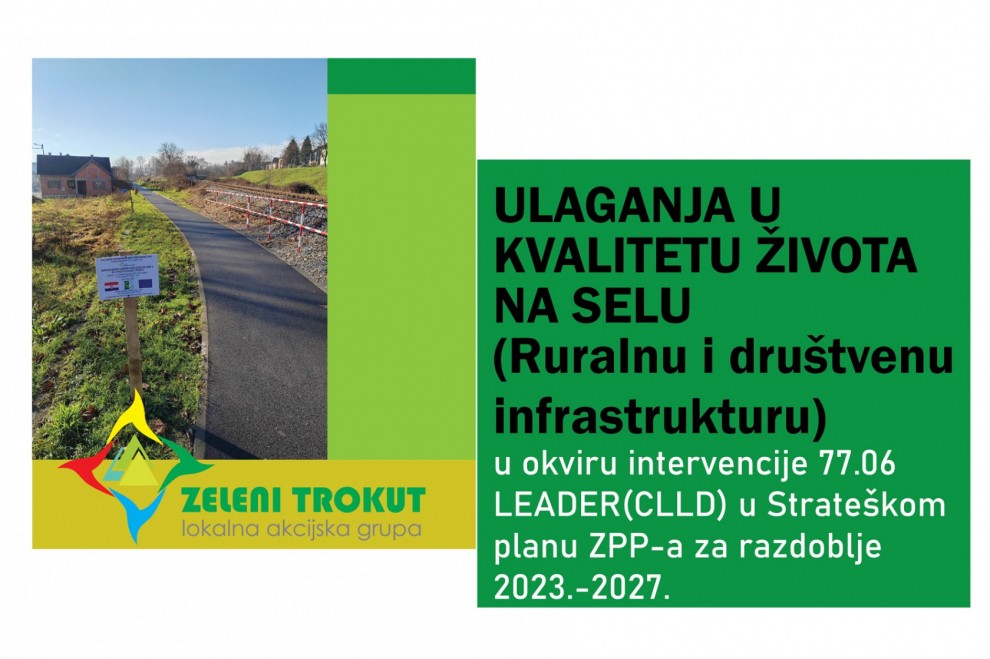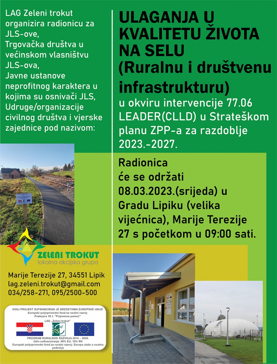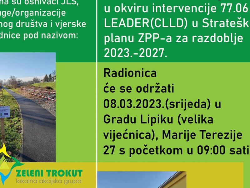 Lag Zeleni trokut organizira radionicu za jedinice lokalne samouprave (JLS), trgovačka društva u većinskom vlasništvu JLS-ova, javne ustanove neprofitnog karaktera u kojima su osnivači JLS, udruge/organizacije civilnog društva i vjerske zajednice pod nazivom: Ulaganja u kvalitetu života na selu (Ruralnu i društvenu infrastrukturu) u okviru intervencije 77.06 LEADER (CLLD) u Strateškom planu ZPP-a za razdoblje 2023.-2027.