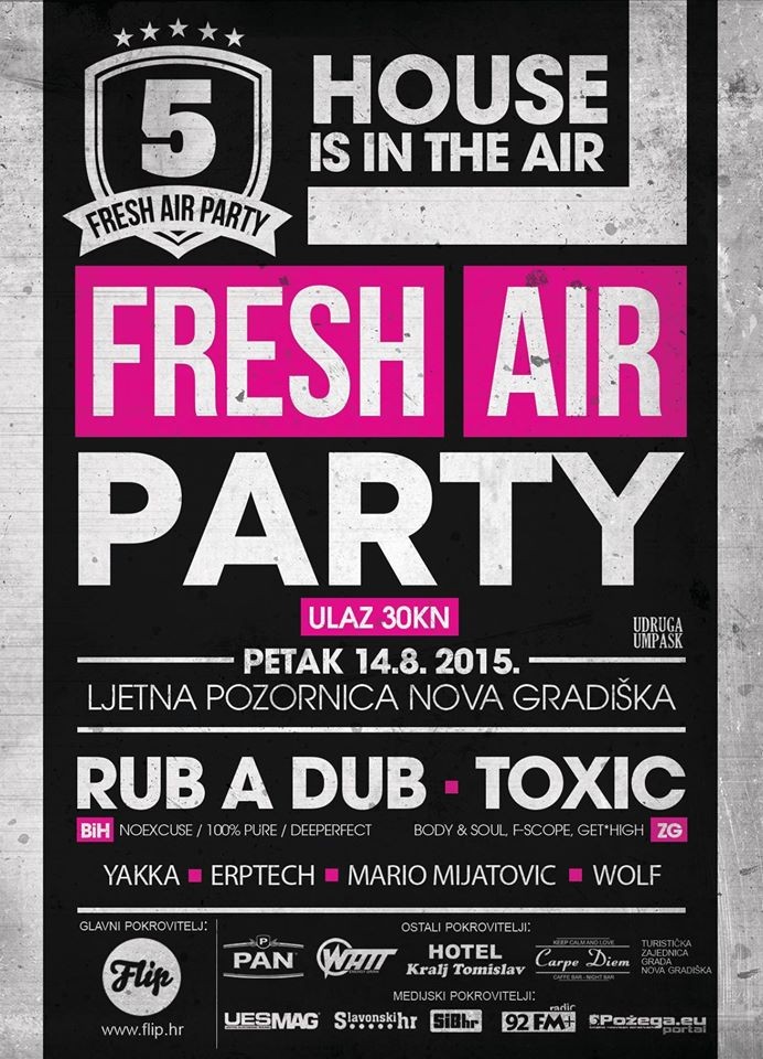 NOVA GRADIŠKA – „Fresh Air Party 2015.“ ove godine po peti put novogradiškoj publici priprema vrhunski provod na otvorenom uz zvukove house glazbe koju promovira od svog prvog izdanja 2011. godine. Pokrenut iz čiste želje da okupi ljubitelje elektronske glazbe, danas okuplja daleko širu masu ljudi koji su ga prepoznali kao kvalitetan ljetni glazbeni događaj. Bez pretjerivanja se može reći da je ovo jedan od najboljih slavonskih open-air partya kad je u pitanju elektronska glazba tako da ako ste u prilici posjetiti, učinite to i priuštite si dobar provod.