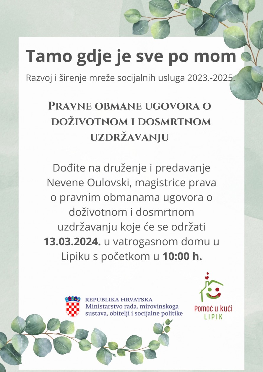 U sklopu prve godine provedbe trogodišnjeg programa „Razvoj i širenje mreže socijalnih usluga za razdoblje 2023.-2025.“ pod nazivom „Tamo gdje je sve po mom“ financiranog od strane Ministarstva rada, mirovinskog sustava, obitelji i socijalne politike usmjerenog na oboljele od Alzheimerove bolesti i drugih demencija čiji je nositelj programa Udruga socijalnih usluga “Pomoć u kući starijim i nemoćnim osobama“ Lipik, provodimo predavanje pod nazivom „Pravne obmane ugovora o doživotnom i dosmrtnom uzdržavanju“ koju će održati naša draga suradnica i kolegica Nevena Oulovski, magistar prava, 13.03.2024. u srijedu u vatrogasnom domu Lipik s početkom u 10.00 sati.