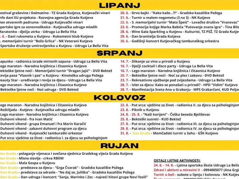 Jedinstvena platforma koja na jednom mjestu uspješno okuplja institucije i ustanove, mjesne kreativce, aktiviste i organizacije civilnog društva, s ciljem osmišljavanja sadržajno bogatog najljepšeg dijela godine, i ovaj će put, Kutjevčanima, ali i gostima grada, ponuditi aktivnost po mjeri, osnažujući tako zajednicu ali i turističku ponudu manifestacije.