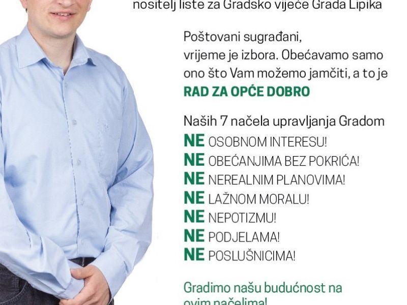 Pitam Vas da li vjerujete u slatkorječiva predizborna obećanja aktualne vlasti kada je riječ o investicijama u visini 950 milijuna kuna. Za provesti navedene investicije koristeći EU fondove Grad Lipik treba uložiti najmanje 190 milijuna kuna vlastitih sredstava. Uz sadašnji proračun za to nam treba najmanje 15 godina ako bi se svi gradski činovnici odrekli svoje plaće. Pitam Vas da li je to realno?