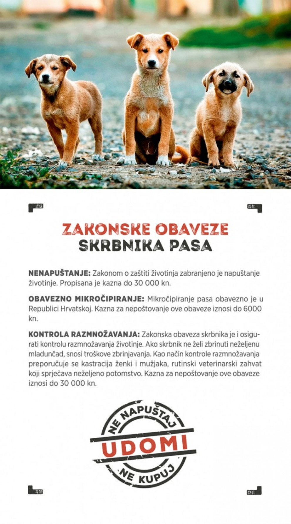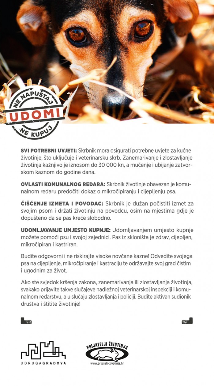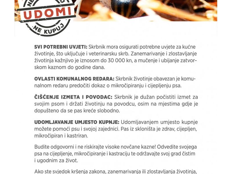 Budite odgovorni i ne riskirajte visoke novčane kazne! Odvedite svojega psa na cijepljenje, mikročipiranje i kastraciju te održavajte svoj grad čistim i ugodnim za život.