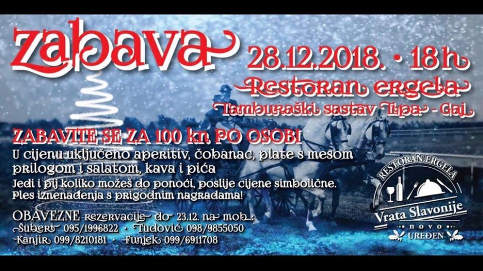 U novouređenom restoranu Ergela i u organizaciji Restorana Vrata Slavonije iz Lipika sljedeći petak, 28. prosinca 2018. s početkom u 18 sati održat će se ZABAVA!