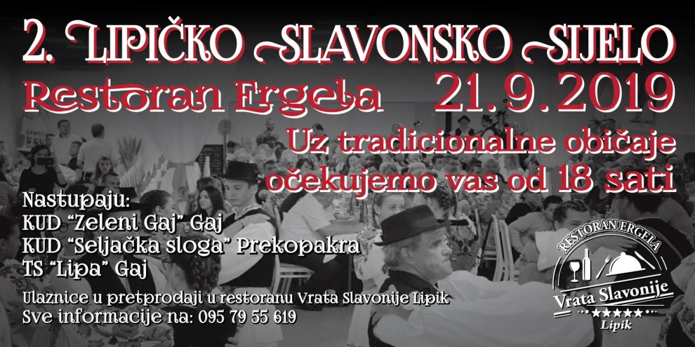 Iz Restorana Vrata Slavonije pozivaju vas da na vrijeme kupite svoje ulaznice te poručuju da vas očekuju u subotu 21. rujna u Restoranu ergela na još jednom veselom, raspjevanom i rasplesanom, 2. lipičkom slavonskom sijelu!