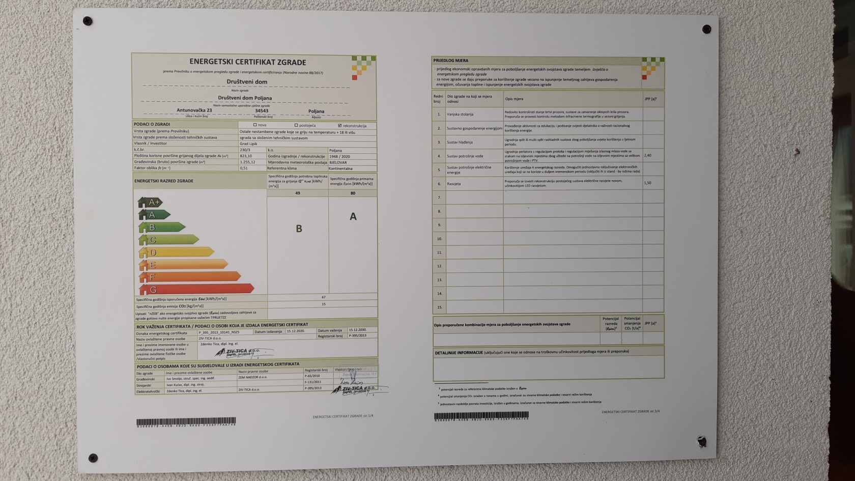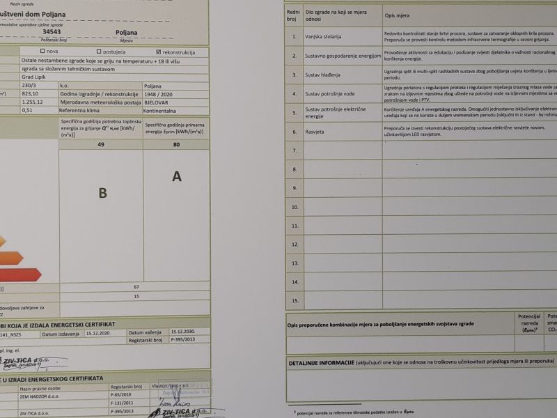 Nakon što su završili radovi na zgradi Društvenoga doma u Poljani napravljen je energetski pregled obnovljene zgrade. Energetski pregled građevine podrazumijeva analizu tehničkih i energetskih svojstava građevine i analizu svih tehničkih sustava u građevini koji troše energiju i vodu s ciljem utvrđivanja učinkovitosti i/ili neučinkovitosti potrošnje energije i vode te donošenje zaključaka i preporuka za poboljšanje energetske učinkovitosti.