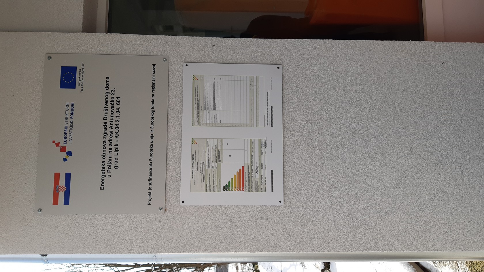 Projekt „Energetska obnova zgrade Društvenog doma u Poljani na adresi Antunovačka 23, grad Lipik“ sufinancira Europska unija iz Europskih strukturnih i investicijskih fondova u financijskom razdoblju 2014.-2020.