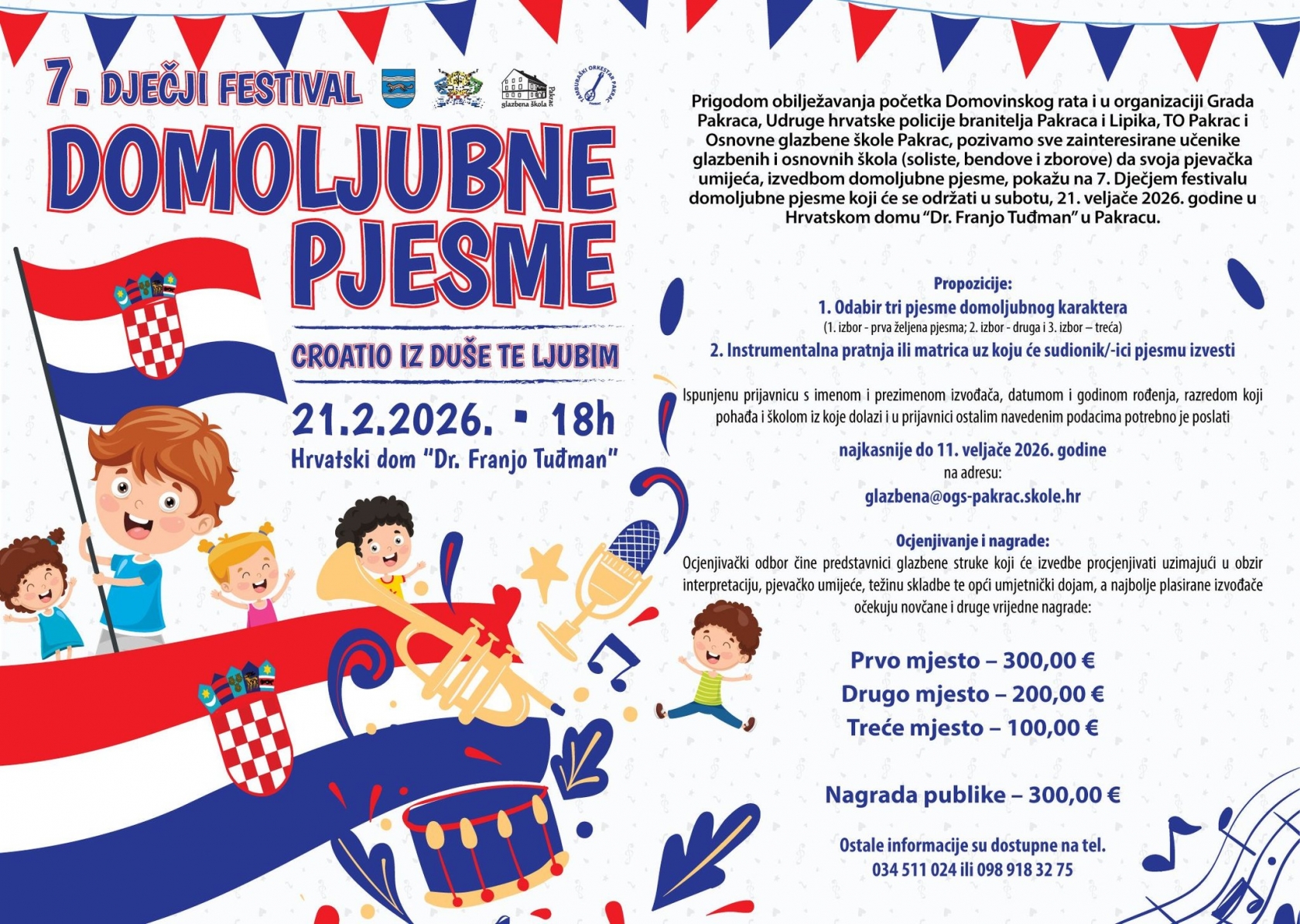U subotu, 21. veljače, u Hrvatskom domu „Dr. Franjo Tuđman“ u Pakracu, s početkom u 18 sati, održat će se 7. Dječji festival domoljubne pjesme „Croatio iz duše te ljubim“. Riječ je o festivalu dječjeg glazbenog stvaralaštva koji već godinama njeguje ljubav prema domovini kroz pjesmu i umjetničko izražavanje najmlađih.