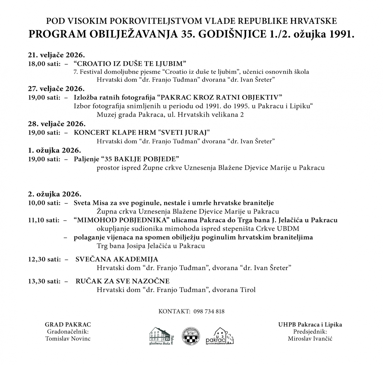 U povodu obilježavanja 35. godišnjice povijesnih događaja s početka ožujka 1991. godine, pod visokim pokroviteljstvom Vlade Republike Hrvatske, u Pakracu će se od 21. veljače do 2. ožujka ove godine održati bogat i sadržajan program komemorativnih, kulturnih i društvenih događanja.