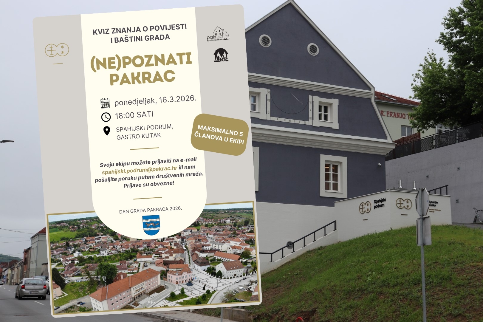 Kviz će se održati u ponedjeljak, 16. ožujka, s početkom u 18 sati u prostoru Spahijskog podruma, odnosno u tamošnjem Gastro kutku. Uz natjecateljski duh i ugodnu atmosferu, za najbolje ekipe osigurane su i vrijedne nagrade.